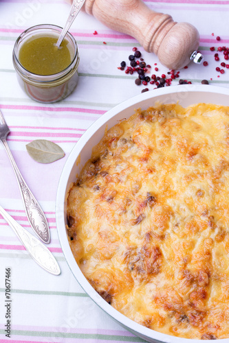 mushrooms and cabbage casserole in pan with pesto, pepper