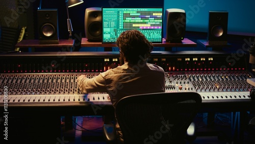 Music producer finishing a track with audio software and mixing console in control room, working with technical equipment in professional studio to process sounds. Audio technician at work. Camera B.