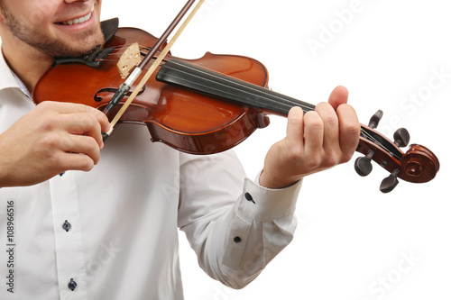 Musician plays violin isolated on white background, close up