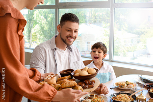 Muslim family having breakfast together. Celebration of Eid al-Fitr