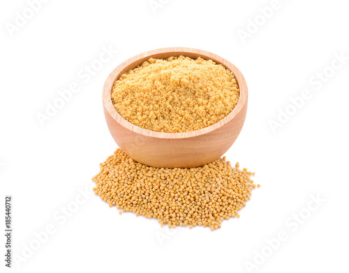 mustard seeds and mustard powder on white background