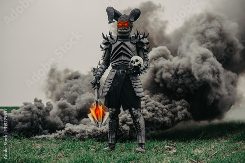 Mutant warrior stands with glowing eyes against a background of black smoke.