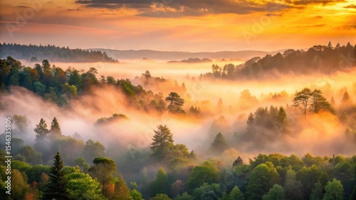 Muted orange hues peek through dense forest foliage as misty fog slowly lifts