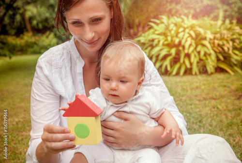 Mutter und Kind spielen zusammen im Garten