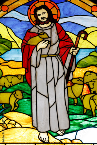 My Tho cathedral. Stained glass. Jesus the good shepherd. My Tho. Vietnam.