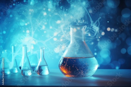 Mysterious bubbling chemical flask with blue liquid and vapor on wooden table