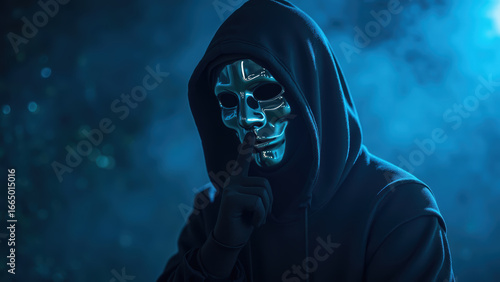 Mysterious figure wearing reflective mask and dark hoodie, shushing with finger to lips, surrounded by smoky blue atmosphere