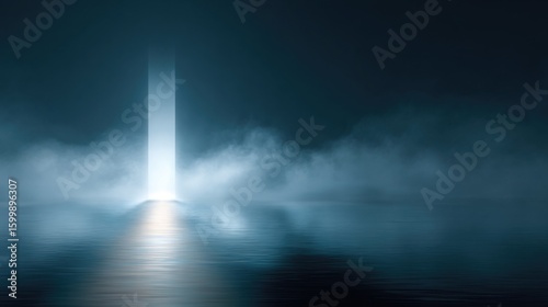 Mysterious glowing tower emerging from foggy dark landscape with dramatic lighting.