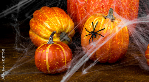 Mysterious halloween background with pumpkins covered in web with spiders.Selective focus.October 31 concept
