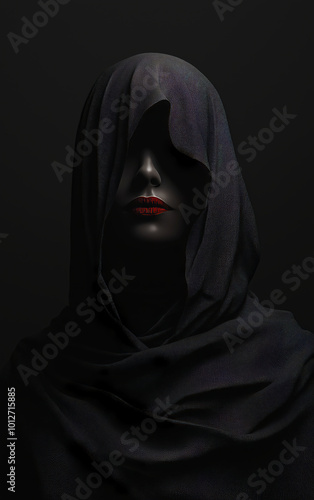 Mysterious Hooded Figure with Red Lips in Darkness.