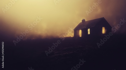 Mysterious house illuminated at dusk foggy landscape photography atmospheric setting wide angle perspective