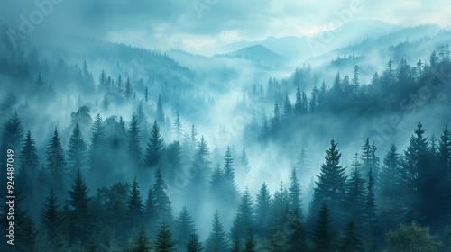 Mysterious Misty Mountain Forest Landscape with Ethereal Atmosphere