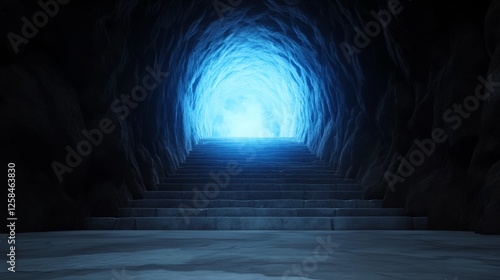 Mysterious stone staircase leading to a bright blue light at the end of a dark cave tunnel.
