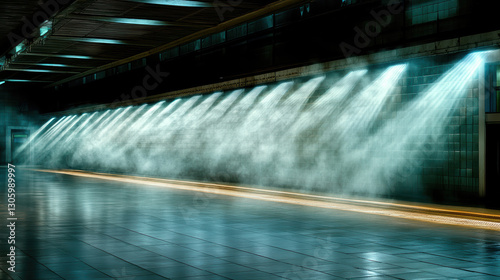 Mysterious train station with ghostly fog and dramatic lighting effects