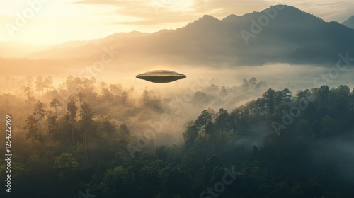 Mysterious UFO hovers over a dense forest in the early morning