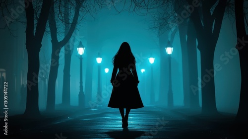 Mysterious woman in a trench coat walking through a foggy city street at night, vintage film noir style, moody lighting.