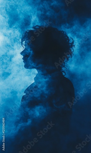 Mysterious woman silhouette enveloped in ethereal blue smoke adding artistic depth portrait