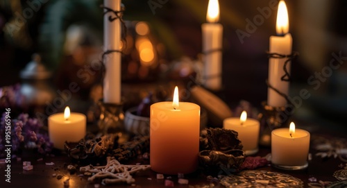 Mystic altar with candles and wax focused on energy cleansing magic rituals