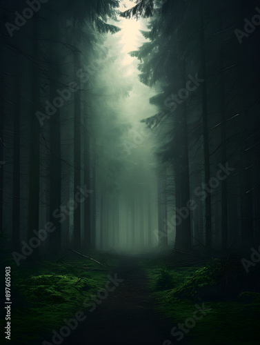 Mystic foggy dark green pine tree forest, landscape background