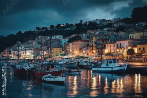 Mystic landscape of the harbor with colorful houses and the boats in Porto Venero, Italy, Liguria in the evening in the light of lanterns created with Generative AI technology