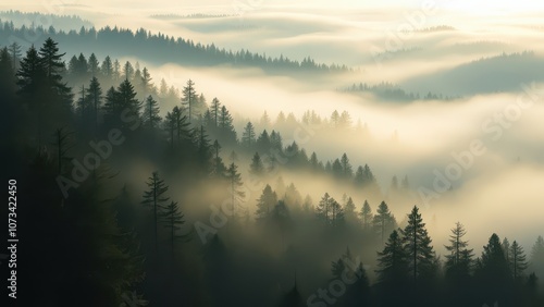 Mystical Forest Valley Shrouded in Morning Mist, Landscape with Emerging Tree Silhouettes and Soft Light
