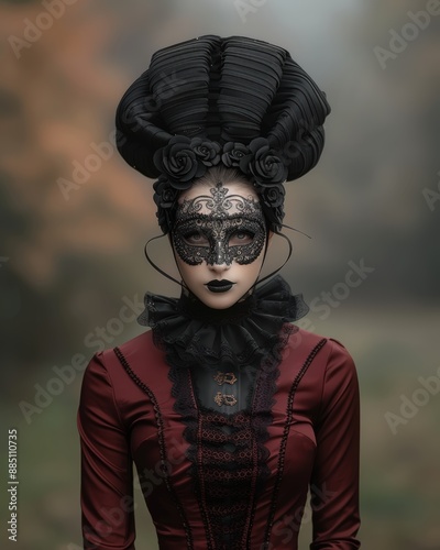 Mystical Gothic Portrait Enigmatic Woman in Ornate Mask and Intricate Jewelry Captivating Eyes and Braided Hair Amidst a Foggy Forested Background Evoking Dark Fantasy and Ethereal Beauty Brainstormin