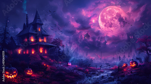 Mystical Halloween Haunted House With Glowing Pumpkins and Full Moon