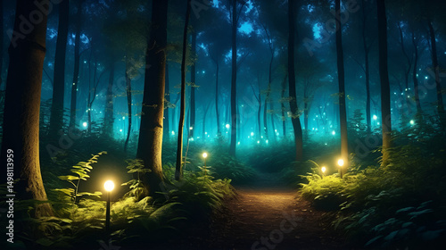 Mystical magical enchanted forest at night with glowing lights. AI generative
