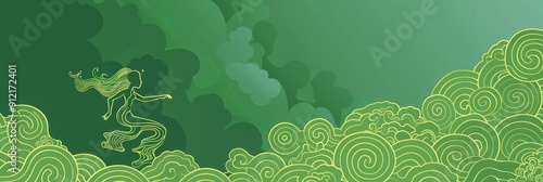 Mystical Mermaid in a Sea of Green Clouds - A graceful mermaid, with flowing hair and a flowing tail, swims through a serene and magical world of swirling green clouds. The image symbolizes fantasy, d