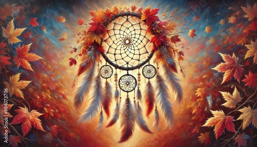 Mystical oil painting of a dreamcatcher adorned with feathers and autumn leaves