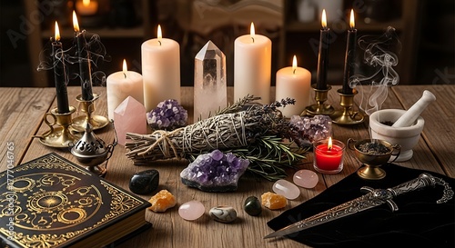 Mystical Ritual Setting: Illuminated by the gentle glow of candlelight, a captivating array of crystals, herbs, and ancient texts lies upon a rustic wooden surface.