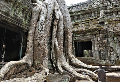 Mystical ruins of the famous Ta Prohm temple. On an ancient stone building there are traces of damage, dilapidated bas-reliefs. An old tree grows on the temple and entangles it with gigantic roots.