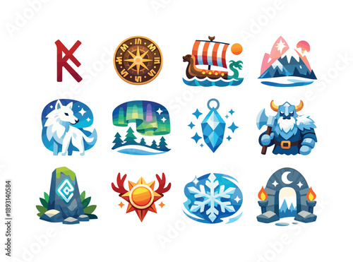 Mythical Northern Icons. Mythical north. Colorful flat vector icons set of mythical north: nordic rune, ancient compass, northern legend, mythic mountain,