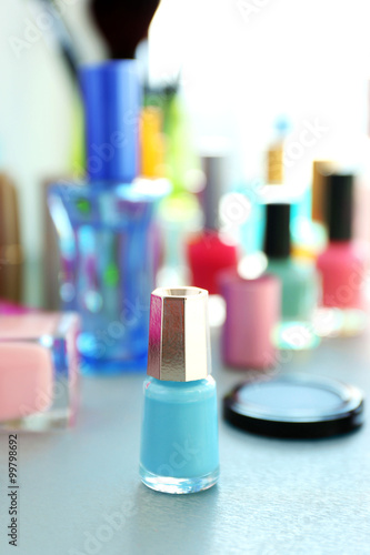 Nail polish with makeup cosmetics on a table