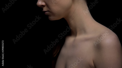 Naked female standing against black background, harassment victim, kidnapping