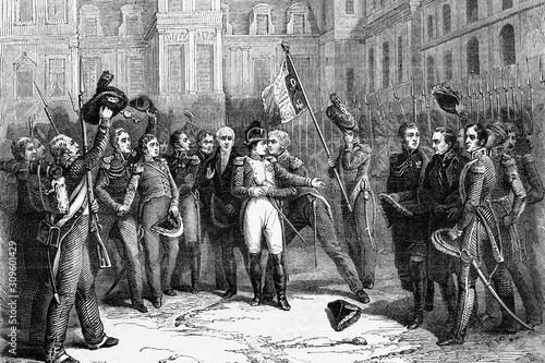 Napoleon's farewell to the imperial guard in the courtyard of the Palace of Fontainebleau. 1814. Antique illustration. 1890.