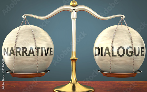 narrative and dialogue staying in balance - pictured as a metal scale with weights and labels narrative and dialogue to symbolize balance and symmetry of those concepts, 3d illustration