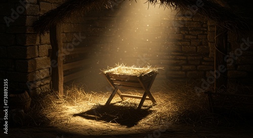 Nativity Scene Manger with Baby Jesus Hay in Stone Stable Religious Christmas Holiday Image