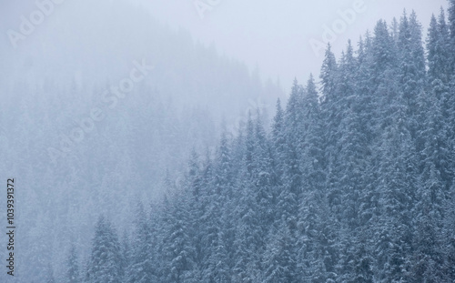 Natural background of a beautiful mountain spruce forest during snowfall, when some trees are clear and some are just silhouettes in the snowy haze in blue tones