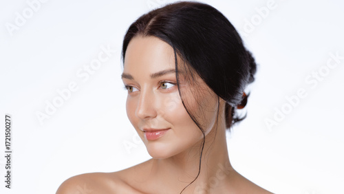 Natural Beauty Portrait Of Woman With Clear Skin In Minimal White Studio