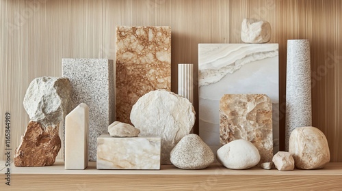 "Natural Elements Display: Marble Blocks and Rocks on Oak Shelf with Light Wood Backdrop"