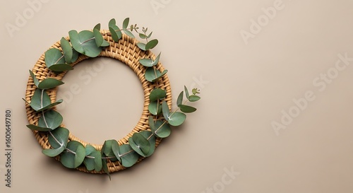 Natural handmade wreath with fresh eucalyptus leaves on a neutral beige background. Minimalist flat lay with copy space for text.