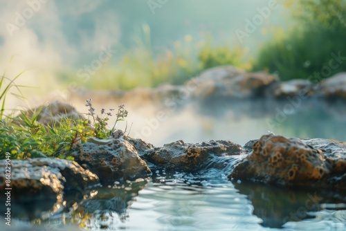 Natural hot springs with steam rising, with a softly blurred background of rocky terrain and greenery.