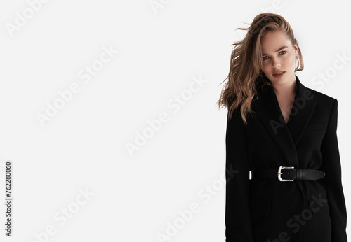 Natural look. Beauty model woman . Model test portrait with young beautiful fashion model posing on grey background. Blond woman in a black blazer . Natural makeup