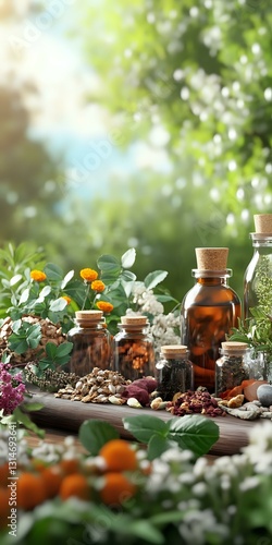 Natural medicine bottles with dried herbs, flowers and berries on wooden surface. Holistic healing ingredients in sunlit garden setting with fresh blooms and greenery.