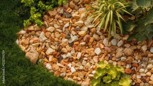 Natural stone mulch in warm earthy tones provides a textured landscape foreground with lush green plants in the background enhancing garden aesthetics.
