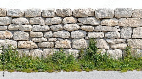 Natural stone wall with green grass, isolated on white background.