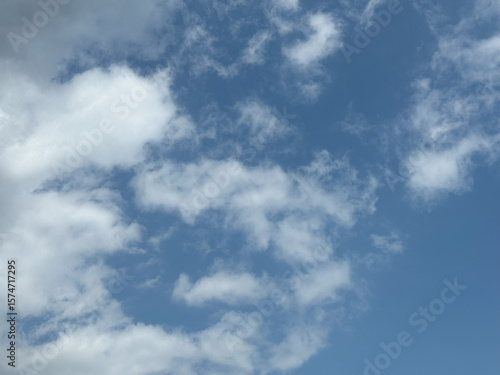 Natural view white clouds on soft blue sky background image. Sun shining through the puffy clouds.