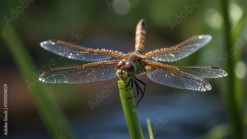 Nature background close-up of a dragonfly perched on a reed, its iridescent body shimmering with water droplets. The blurred background of leaves and water adds a serene, refreshing feel.