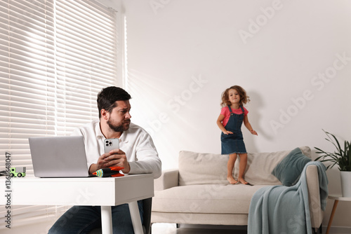 Naughty daughter disturbing her overwhelmed father at home